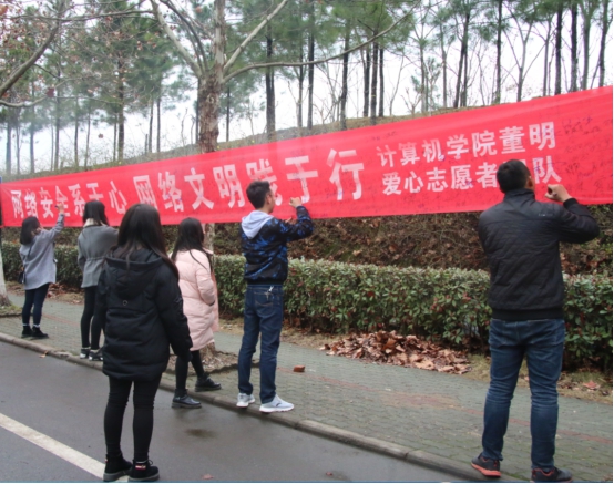 计算机学院“清朗网络”志愿服务队开展了以“共建网络安全,共享网络文明”为主题的四项志愿服务活动。“网络安全系于心,网络文明践于行”横幅签名活动吸引数百名同学参加;网络文明倡议书在贴吧被众多同学顶贴并评论,大家纷纷表示会认真践行倡议书中的要求,争当“四有”中国好网民,青年好榜样。