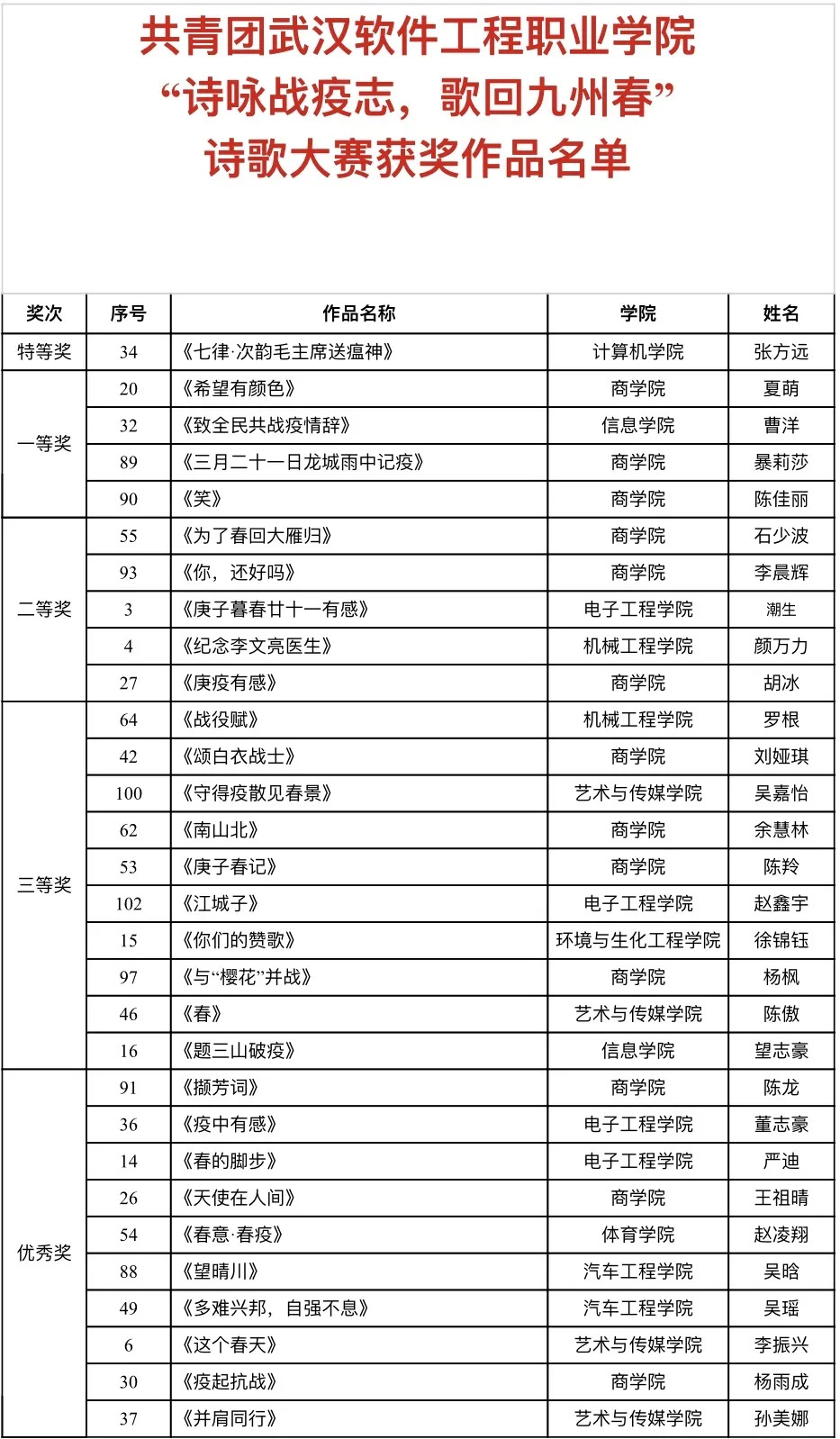 为深入学习贯彻落实习近平新时代中国特色社会主义思想及习近平总书记关于新型冠状病毒肺炎疫情防控工作的系列重要讲话精神,促进新时代校园原创文学的繁荣发展,深化我校中华优秀传统文化推广,增强学生的文化自信与认同,校团委于3月12日-3月22日组织举办了“诗咏战疫志,歌回九州春”诗歌大赛活动。活动开办历时11天得到了同学们的广泛参与,陆续收到诗歌作品来稿共计103篇,经大赛组委会讨论,特增设优秀奖10名。通过评委们一轮又一轮公平公正的初审、复审及评奖,现将获奖作品名单公布如下: