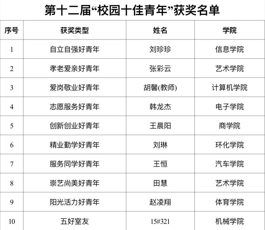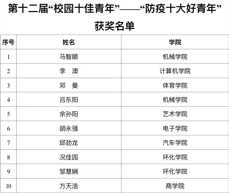 我校第十二届“校园十佳青年”、“校园十佳青年—防疫十大好青年”评选活动自4月初启动以来,通过校团委微博、微信公众号等进行广泛宣传,各学院高度重视、积极动员、精心组织,经过预评、网上投票等阶段,共有25名“校园十佳青年”、20名“校园十佳青年——防疫十大好青年”候选人进入终审环节。