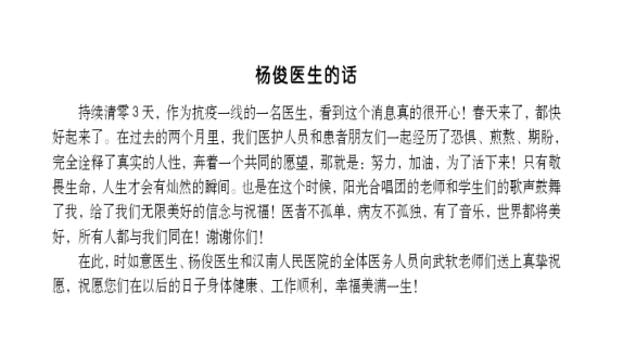 与此同时,我校也收到了来自白衣天使的祝愿,她们是武汉汉南人民医院党委张巧诊、杨俊医生及全体驻我校方舱隔离区的医护人员。