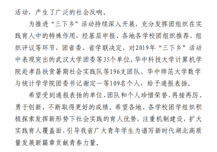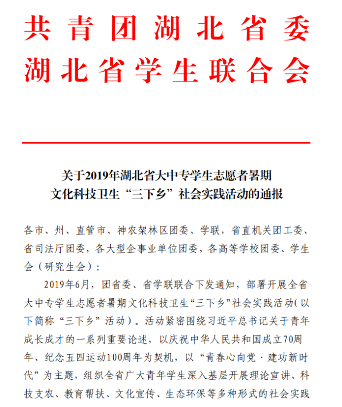 新年新气象,1月2日,我校“橙心橙意”赴宜昌秭归脐橙经济乡村调研团队荣获共青团湖北省委员会2019年大中专学生志愿者暑期文化科技卫生“三下乡”社会实践活动优秀团队奖,成员夏成思荣获先进个人奖。