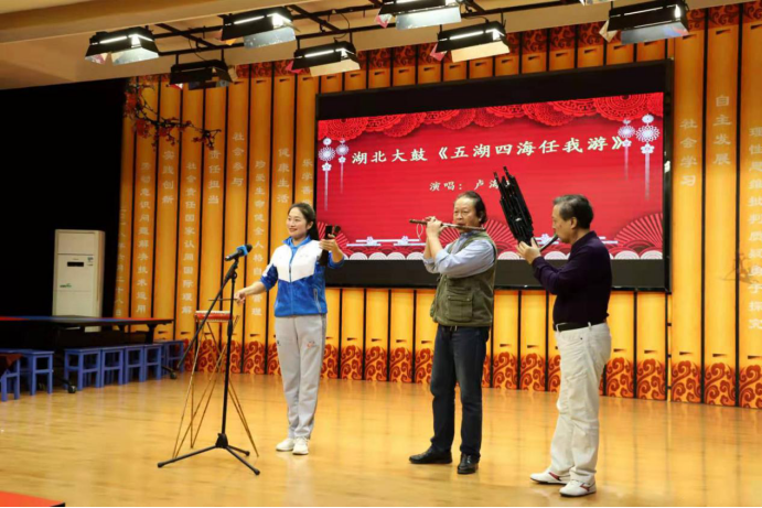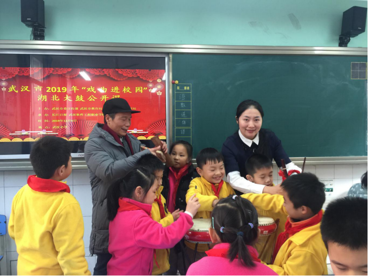 据悉,武汉市2019年“戏曲进校园”活动由武汉市委宣传部、武汉市教育局、武汉市文化和旅游局、武汉市文学艺术届联合会、武汉市财政局、共青团武汉市委员会共同主办,我校吸纳湖北大鼓国家级代表性传承人与我校湖北大鼓社团共同参与承办,先后在黄陂区田铺街小学、武昌水果湖一小、洪山区一小书城路分校、武汉理工大学附属小学、湖北大学附属小学、武汉关山中学、湖北华一寄宿学校、武汉市楚才小学、武汉小学、武汉软件工程职业学院等大中小学开展12场湖北大鼓公开课,受众超5000人次,并形成了讲座、演出、教学、展示相结合的一套完善的教学体系。2019年3月,我校湖北大鼓社团创作了具有湖北地方特色、弘扬社会主义核心价值观的经典曲目湖北大鼓《社会主义核心价值观》被“学习强国”平台推送学习。