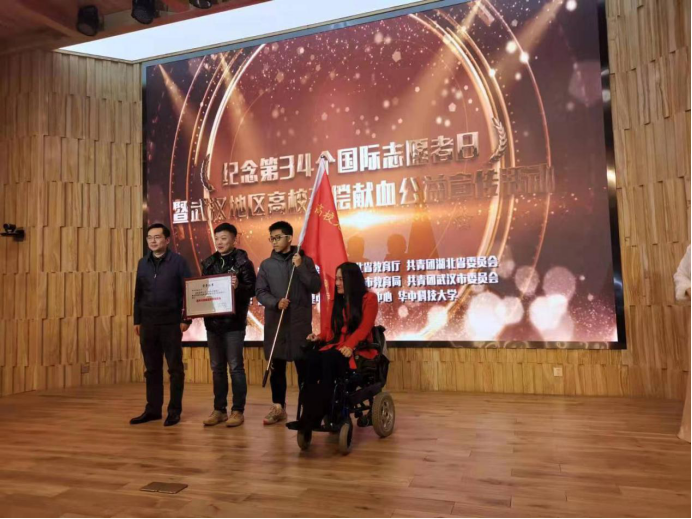 2019年12月4日,由省卫生健康委、省教育厅、共青团湖北省委联合举办的“纪念第34个国际志愿者日暨武汉地区高校无偿献血公益宣传活动”中,我校董明无偿献血青年志愿者服务队被授予“湖北省高校无偿献血志愿服务集体”荣誉称号,冯淳博、柯佳盈两位学生荣获“湖北省高校无偿献血志愿服务个人”荣誉称号。