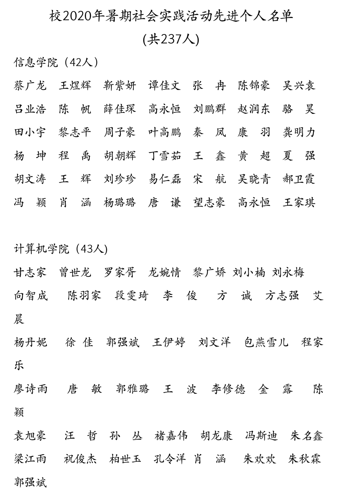 为了宣传典型,表彰先进,进一步推动社会实践工作深入开展,营造青年学生实践成长的良好导向和氛围,校团委决定授予信息学院等4个学院,陈浩等237名同学2020年大学生暑期社会活动优秀团队和优秀个人荣誉称号。