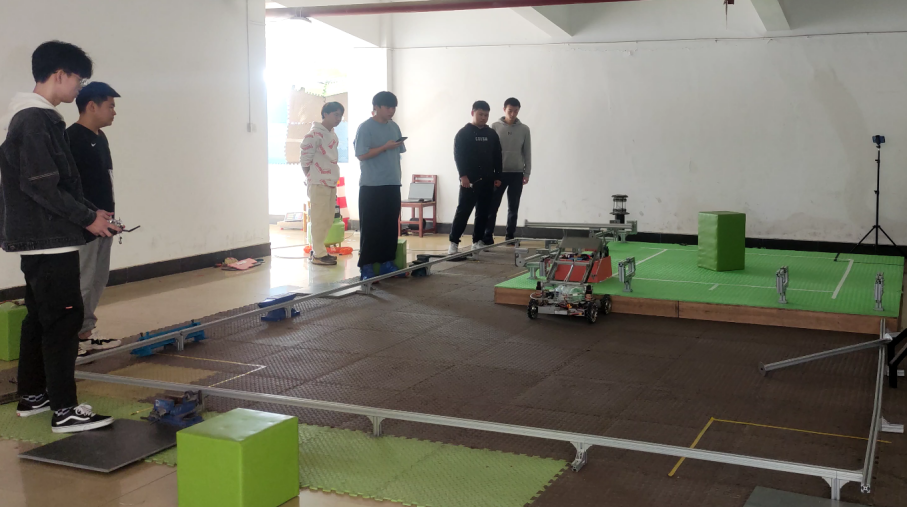 而障碍挑战赛,需要首先让自动车完成障碍杆的布置,然后由手动机器人将障碍杆清除。每个障碍杆布置到位可得10分,成功清除可得10分,全部4根障碍杆完成布置和清除可以得到80分。首发出场的机电2002班陈飞宇同学,顶住了巨大的压力,在自动机器人失误的情况下完成了比赛。由于自动机器人未能将其中一根横杆布置到位,因此他的完成成绩为60分。队员们在经过短暂调整后,派出我们的王牌队员——来自电气2001班的黎沛哲同学。自动机器人完成了所有横杆的布置后,他行云流水的完成了3根横杆的清除,但是剩下一根横杆位置超出我们机器人的设计行程范围,无法完成清除。最后他以70分,37秒的成绩完成了比赛,在所有学校中位列22名,拿下全国三等奖。这次比赛,按照训练成绩,是有望拿到冠军的,却因为种种原因而未能如愿,留下了很大的遗憾。不过,由于清障车的机构设计非常巧妙和高效,获得了2021年全国大学生机器人大赛的唯一“最佳技术奖”。参赛的同学们纷纷表示,明年将以更好的表现和努力,争取更优异的成绩!