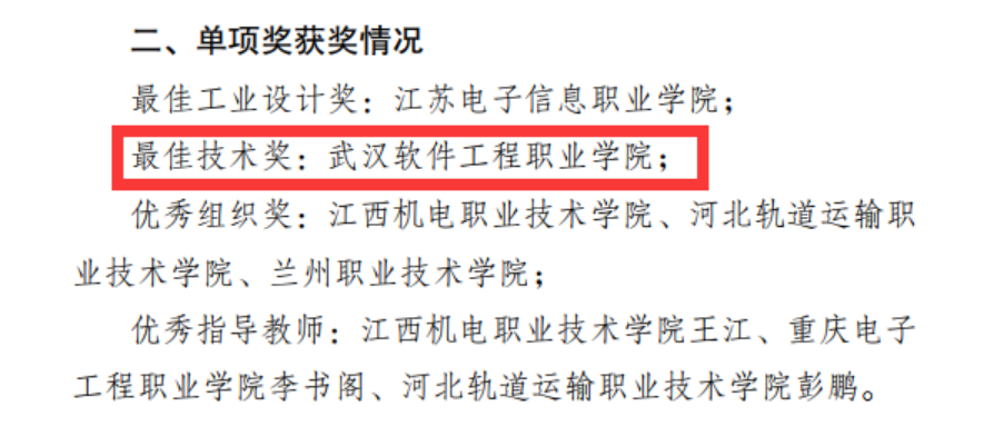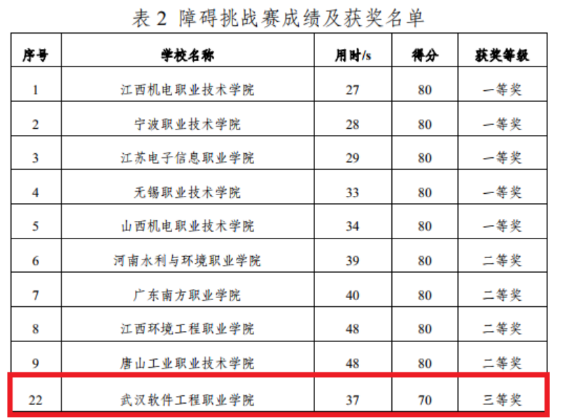 在11月中旬结束的第二十届全国大学生机器人ROBOTAC大赛中,武汉软件工程职业学院代表队获得多点射击赛二等奖、障碍挑战赛三等奖、最佳技术奖。