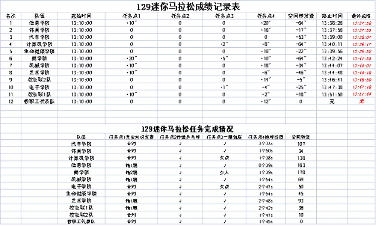 选手们在校园各处龙腾虎跃,好不热闹!活动期间,校学生会、承办学院的志愿者们在宣传补给点井然有序地递水、准备医疗用品,为全校参赛者做好跑步期间的后勤保障。在各个活动点,各学院代表队都出色地完成了任务,最终抵达终点。经过激烈的角逐,来自信息学院的十名队员以27分52秒的综合时长勇拔头筹。下面进入颁奖环节啦!