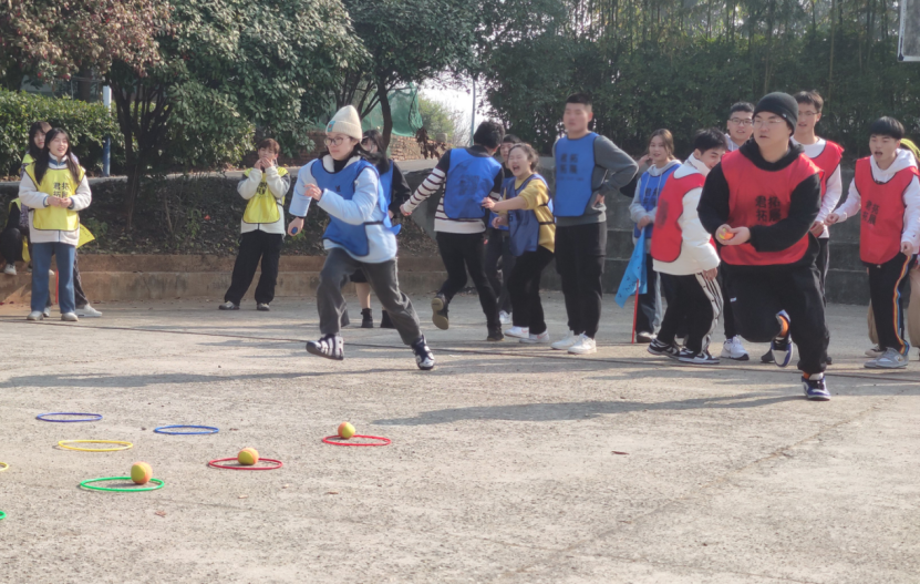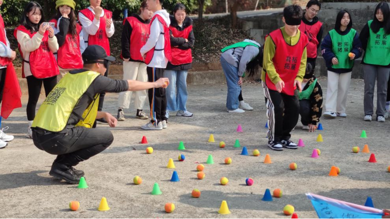 在“折返跑放球连线”环节中,大家群策群力,为赢得最终的胜利贡献自己的智慧力量。该环节有效提升了同学们的随机应变能力和反应能力。在“沙场点兵”环节中,四支队伍围成正方形,由队伍中的“司令”和“参谋长”指挥沙盘中蒙眼的“士兵”移动,通过比试看谁能最先取得胜利。通过这个游戏同学们理解了团队沟通的重要性。在“连连看”环节和“击鼓颠球”环节中,各支队伍成员按照活动要求,分别以小组为单位团结协作,增强了团队成员之间的默契度和凝聚力。