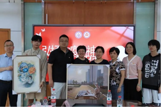 随后,我校艺术与传媒学院优秀学子代表郭子豪和王震同学向白衣天使赠画,并向大家分享了作品创作灵感的来源。创作《最暖夕阳》的郭子豪说:“这是他在疫情中印象最深刻的暖人一幕,希望能将这种感动和希望传递,也希望通过这样的方式能给我们的医护工作者打打气。”水彩画《最美逆行者》是学生王震精心创作的,画面中心是最美逆行者们,画面下方是病人对医护人员表达感激的场景,医护人员身后满是花语为“美丽动人、依依不舍”的芍药花,隐隐点题。