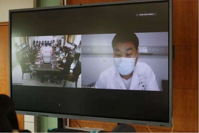 首先,处于隔离中的杨凡医生通过视频连线的方式介绍了自己团队支援上海抗疫经历。从他的分享中我们看到了顽强拼搏的抗疫精神和医者仁心的使命担当,也看到了生命昂扬的真谛,在座的党员纷纷表示,将以杨凡医生这样优秀的青年先锋为榜样,坚定入党初心,担当新时代使命,更加积极地投身到学习工作中去。