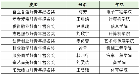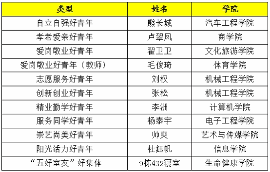 经过前期学院推选、校团委两次会议集中讨论、网络投票等流程,确定本届十佳青年及十佳青年提名人选20组。会上,各学院团总支书记对本学院十佳青年及十佳青年提名人选基本情况进行介绍。经过讨论、投票,最终确定熊长城等11名同学和老师(含集体)为第十五届“校园十佳青年”,谭芳等9名同学为第十五届“校园十佳青年”提名奖。具体名单如下: