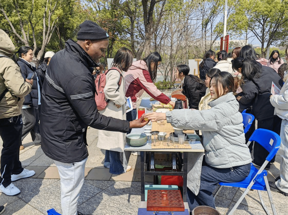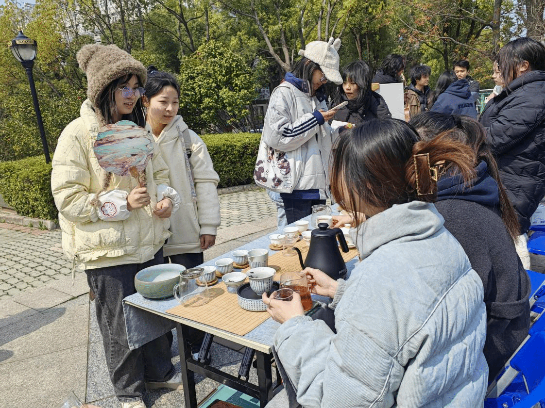 “茶艺点韵,雅趣时光”区域则以一场优雅的茶艺表演吸引了众多目光,女生们以柔美姿态奉上香茗,搭配精致小蛋糕,让师生们在品味茶香中感受传统文化的独特魅力。