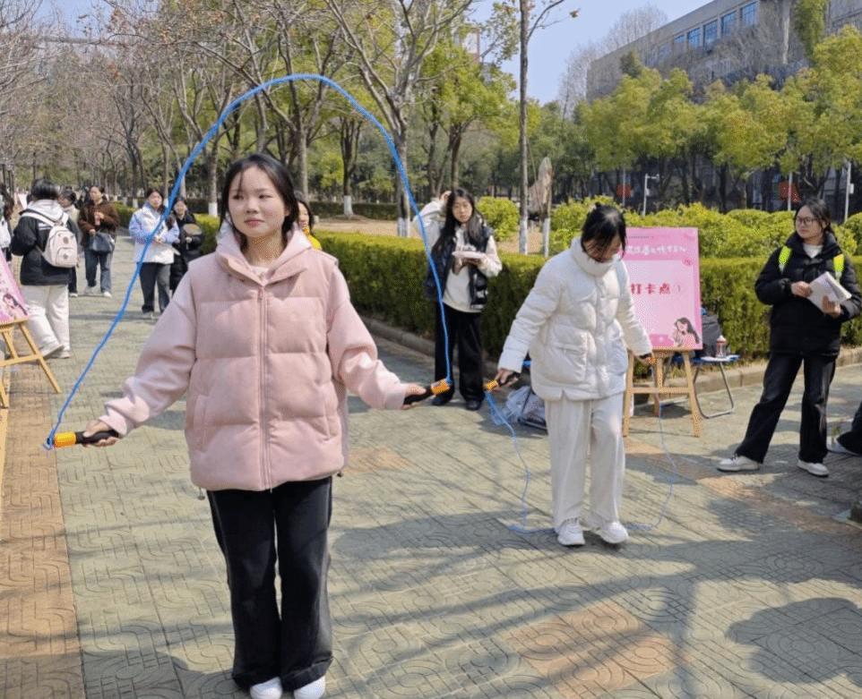 活动现场共设置了10个特色活动区域,每个区域都充满了传统文化的魅力和女性的灵动风采。在“趣味挑战,活力满满”区域,同学们积极参与跳绳、踢毽子、呼啦圈、投壶等传统游戏,挑战成功后可领取专属漆扇,感受传统技艺与现代趣味的完美结合。