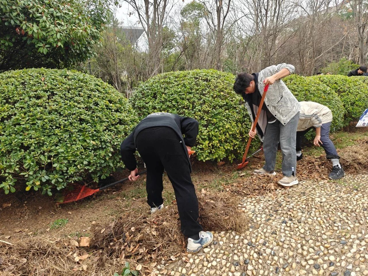 植树完成后,同学们前往灌木区为海桐树做树盘。据园艺师介绍,树盘指树冠垂直投影部位的土壤,做树盘即是清理树盘内的杂草和落叶并翻土,有利于保持土壤透气性,减少土壤水分蒸发,改善土壤结构,抑制杂草生长。随后,同学们便在园艺师指导下分组耙落叶,起土翻土。