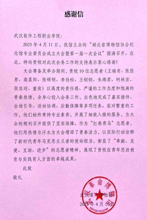 服务期间,武软志愿者们始终坚守岗位,认真履行职责。他们以专业的服务、热情的态度和高度的责任感,完成了从场地布置、人员签到、酒店住宿安排到会议引导、演出服务等一系列工作任务,展现出了良好的团队精神和纪律意识。武汉革命博物馆也专门发来感谢信,感谢他们的无私奉献与高质量服务。