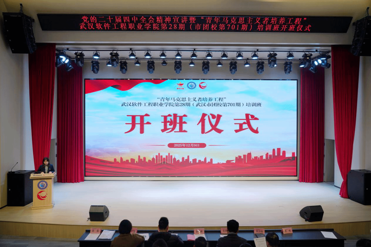 12月9日下午,党的二十届四中共全会精神宣讲暨“青年马克思主义者培养工程”武汉软件工程职业学院第28期(武汉市团校第701期)培训班开班仪式在学术楼一号报告厅隆重举行。市团校副校长陈宏,校党委书记蒋兴鹏,党委组织部、党委宣传部、党委学工部、团委、马克思主义学院相关负责人,各学院党总支副书记、团总支书记,本期“青马班”全体导师、学员及第27期结业学员代表齐聚一堂,共赴青春之约。开班仪式由校团委书记陈菡主持。