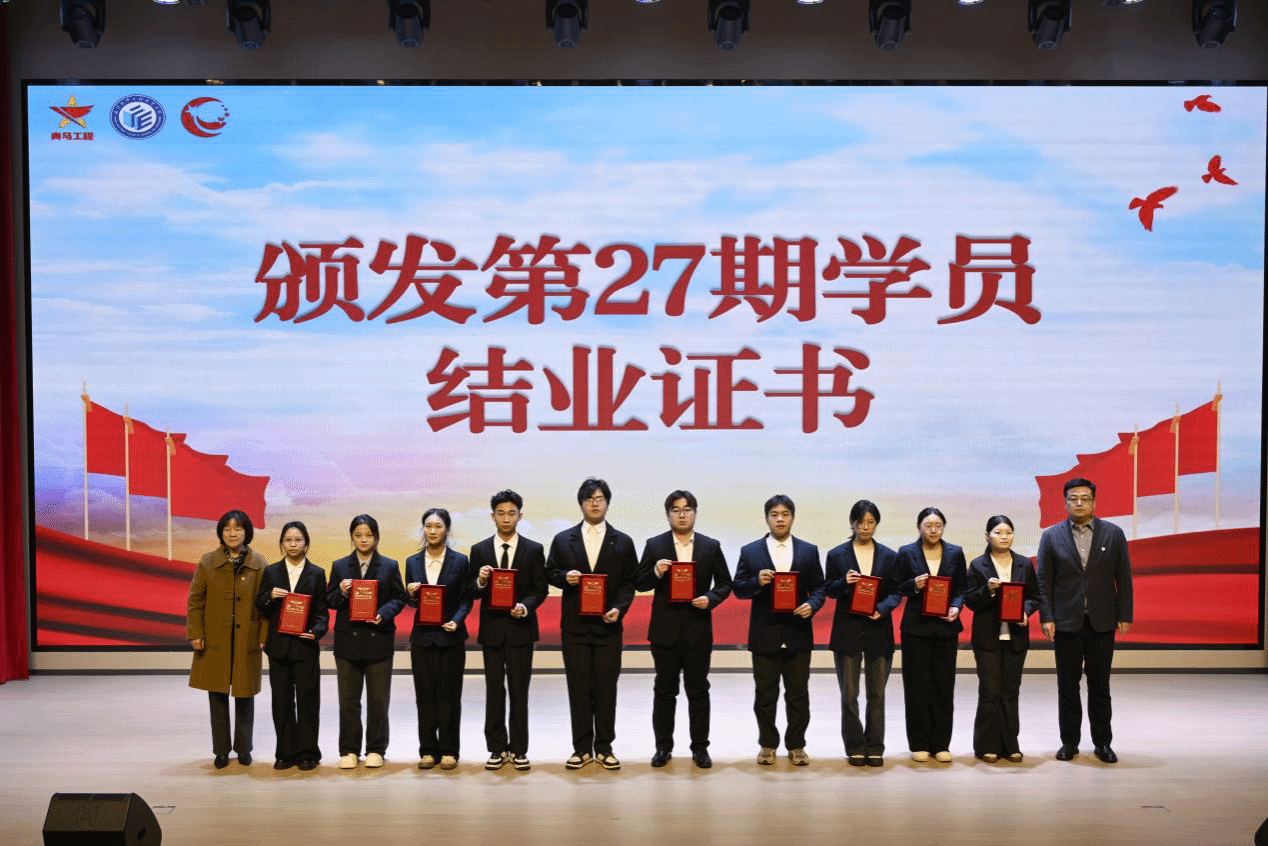 党委学工部部长张胜洪、党委组织部副部长刘建华共同为第27期青马班学员代表颁发结业证书,见证他们在理论学习与实践锻炼中收获成长、圆满结业;党委宣传部常务副部长董明、马克思主义学院党总支书记黄剑锋为新一期青马班导师代表颁发聘书,为培训班高质量开展筑牢师资保障,助力学员在成长道路上精准领航。仪式上,本期“青马班”班主任、校团委组织科副科长唐子靓还就培训要求进行说明。