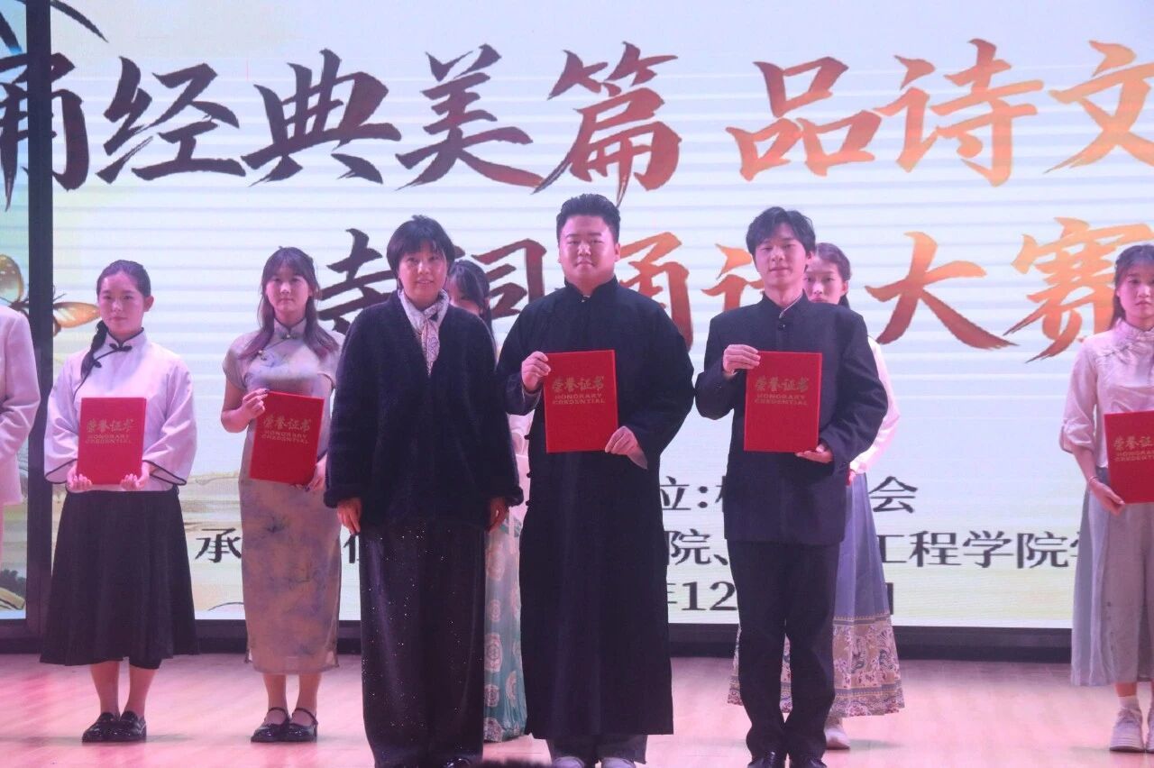 古典的平仄与现代的激情在这里相遇,青春的声音与永恒的诗篇在此刻共鸣。12月11日下午,由校学生会主办,汽车工程学院、生命健康学院学生分会承办的“诵经典美篇 品诗文雅韵”诗词诵读比赛在综合楼多功能厅精彩上演。来自全校11个学院的代表队同台竞技,为师生呈现了一场融贯古今、声情并茂的诗意盛宴。