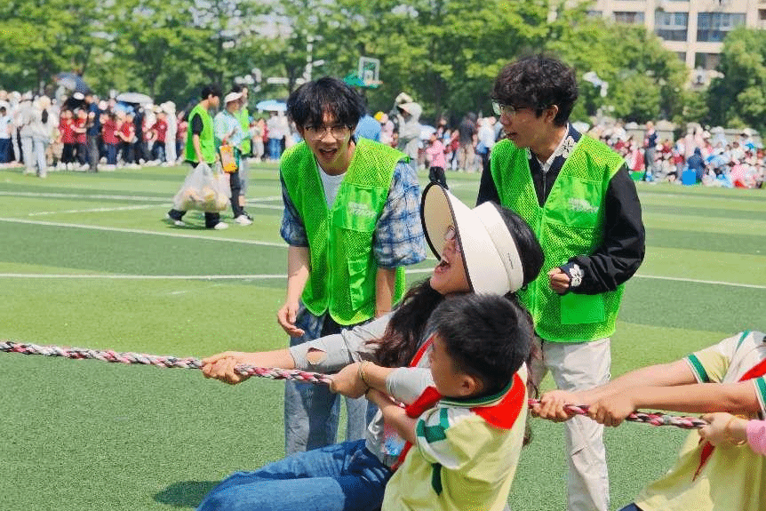 运动会现场洋溢着欢乐温馨的氛围,一个个亲子组合携手踏上赛场,共同迎接趣味挑战。志愿者们穿梭其中,全力保障赛事顺利进行。在 “背对背夹球跑” 比赛区域,志愿者们为家长和孩子分发比赛用球,仔细讲解比赛规则,确保每一组家庭都能安全、有序参赛;发令声响起后,志愿者们紧跟队伍奔跑,防止选手们摔倒。“亲子拔河比赛” 环节,志愿者们摆放拔河绳的位置,调整参赛选手的姿势,在比赛中为双方选手加油鼓劲······在为期三天的志愿服务过程中,用温暖的守护为亲子互动保驾护航。