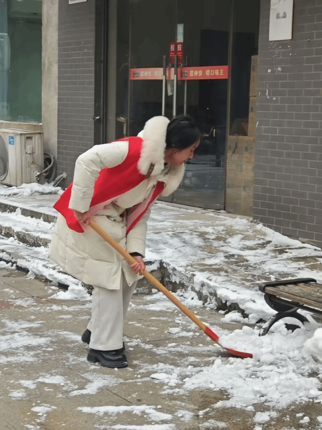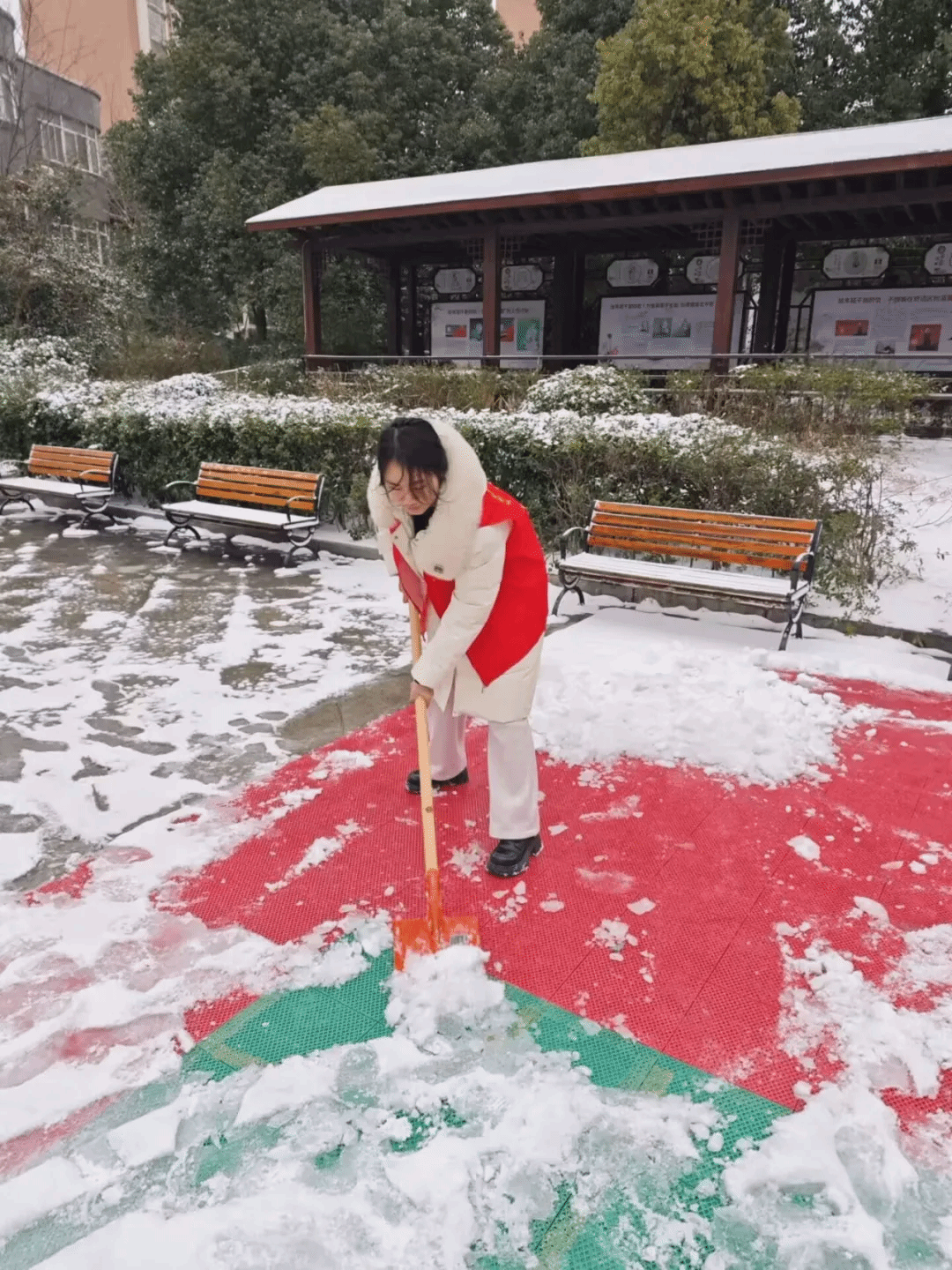 网络2553班张彦乐则在强降雪天气中挺身而出,主动参与社区清雪除冰志愿行动。她手持铁锹铲除主干道、单元门口及台阶坡道上的积雪暗冰;面对坚硬冰层,她反复敲击清理;看到行动不便的老人,她主动搀扶,并优先清扫其门前道路。她的辛勤劳动保障了居民特别是老年群体的出行安全,赢得社区一致赞誉。