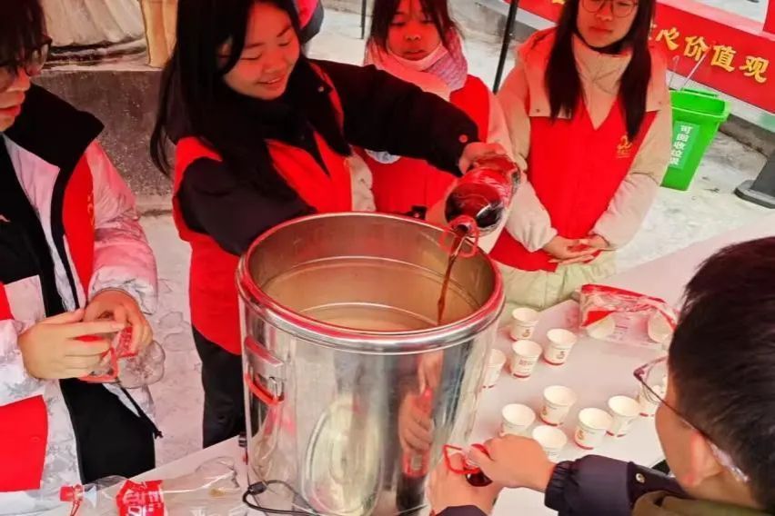 连锁 2301 班的王瑶红同学满怀热忱,积极投身于巴东县“青春志愿行,温暖回家路”的志愿活动中。活动现场,她身着鲜艳的志愿者马甲,穿梭在人来人往的客运站。尽管寒风不断灌进衣袖,手被冻得通红,王瑶红却依旧热情满满地为拖着沉重行李、神色疲惫的返乡旅客递上一杯杯热气腾腾的姜汁可乐。她深深明白,自己递出的每一杯姜汁可乐,不仅在严寒中为旅客驱散了周身的寒意,更成为传递温暖与善意的纽带。这份微小却炽热的付出,就像冬日里的点点微光,汇聚起来,照亮了社会的每一个角落,成为构建和谐美好社会不可或缺的力量。